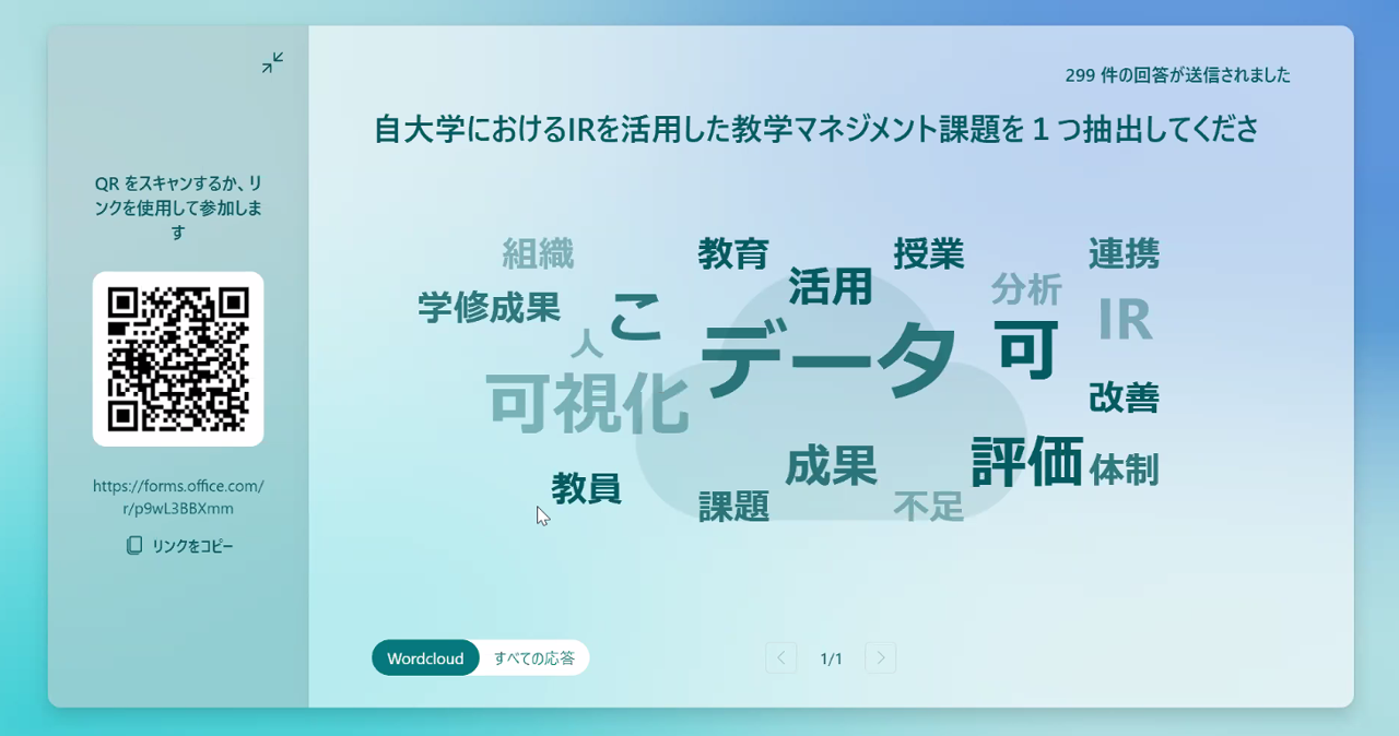 冒頭、参加者は各自スマートフォンでQRコードをスキャンし、「自大学におけるIRを活用した教学マネジメント課題を1つ抽出する」というアンケートに回答しました。Wordcloudを利用し、参加者の回答状況をリアルタイムに視覚化していくと、「データ」「可視化」「体制」など、各大学が抱えている課題が浮き彫りになりました。